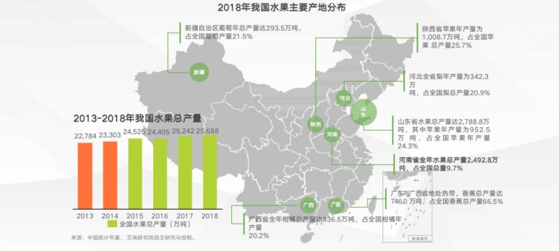1、我國(guó)幅員遼闊,水果品種繁多,總產(chǎn)量居全球前列:我國(guó)果品總面積及產(chǎn)量常年穩(wěn)居全球首位,為許多地方經(jīng)濟(jì)發(fā)展的支柱,水果產(chǎn)地多分布于北部山東、河北一帶,及南部廣東、廣西等熱帶地區(qū)。據(jù)統(tǒng)計(jì)近年來(lái)我國(guó)水果總產(chǎn)量仍呈現(xiàn)持續(xù)上升趨勢(shì),2018年全國(guó)總產(chǎn)量達(dá)25,688萬(wàn)噸。