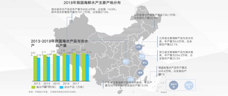 2、我國(guó)海鮮水產(chǎn)主要分布于華東沿海地區(qū):我國(guó)海鮮水產(chǎn)種類主要分為海水產(chǎn)品與淡水產(chǎn)品,深水產(chǎn)品產(chǎn)地主要分布于華東沿海地區(qū),如山東、浙江、福建一帶,淡 水產(chǎn)品分布稍加廣泛,主要產(chǎn)地位于湖北、江蘇、廣東等地。2018年我國(guó)水產(chǎn)品總產(chǎn)量達(dá)6,458萬(wàn)噸產(chǎn)量各達(dá)3,128萬(wàn)噸 及8,625萬(wàn)噸。