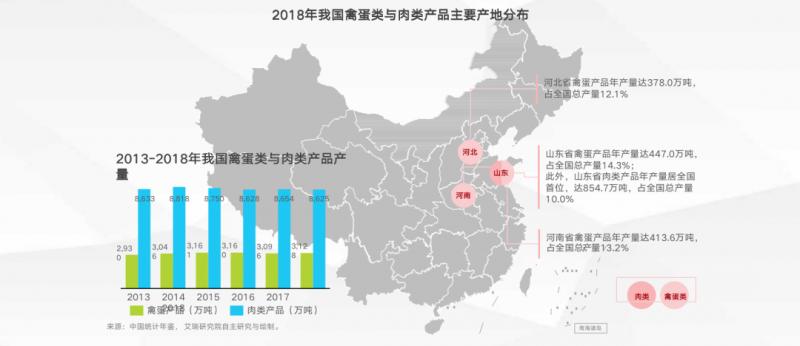 3、我國(guó)肉類和禽蛋類產(chǎn)地呈明顯地域性,華東一帶為高產(chǎn)區(qū)域:農(nóng)業(yè)作為我國(guó)禽蛋類產(chǎn)品產(chǎn)地主要分布于華東地區(qū),如山東、河北、河南一帶,肉類產(chǎn)品產(chǎn)地較為分散。2018年我國(guó)禽蛋產(chǎn)品和肉類產(chǎn)品產(chǎn)量各達(dá)3,128萬(wàn)噸及8,625萬(wàn)噸。
