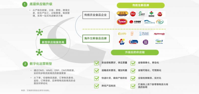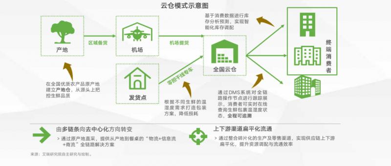 3、一站式新零售解決方案填補(bǔ)生鮮B2C模式市場(chǎng)空白:傳統(tǒng)生鮮供應(yīng)鏈企業(yè)大多是2B模式,服務(wù)于餐飲、超市、加工廠等,不具備2C端的服務(wù)能力。因此,生鮮新零售玩家必 須依靠自身額外建立2C端服務(wù)資源。這種供應(yīng)鏈兩端的分立導(dǎo)致全鏈條上的資源與數(shù)據(jù)不能充分整合利用,因而效率始終 無(wú)法得到有效提升。針對(duì)這一痛點(diǎn),新型的云倉(cāng)模式應(yīng)運(yùn)而生,新型供應(yīng)鏈服務(wù)商通過(guò)整合全國(guó)范圍內(nèi)的產(chǎn)業(yè)鏈資源,形 成生鮮供應(yīng)鏈平臺(tái),從而實(shí)現(xiàn)了從產(chǎn)地至終端消費(fèi)者的一站式生鮮供應(yīng)鏈解決方案。