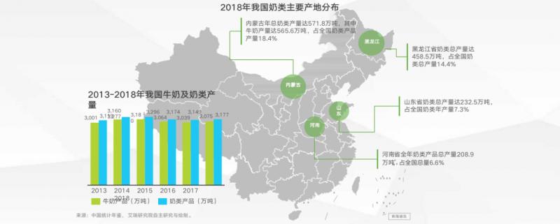 4、我國(guó)奶類品產(chǎn)地分布不均,對(duì)生鮮物流供應(yīng)鏈網(wǎng)有較強(qiáng)依賴:我國(guó)奶類產(chǎn)品產(chǎn)地多分布于北部?jī)?nèi)蒙古、黑龍江、山東、河南等地區(qū)。據(jù)統(tǒng)計(jì)近年來(lái)我國(guó)奶類產(chǎn)品總產(chǎn)量仍呈現(xiàn)持續(xù)上升趨勢(shì),2018年全國(guó)奶類產(chǎn)品總產(chǎn)量達(dá)3,177萬(wàn)噸。
