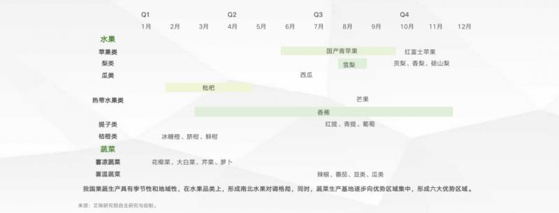 5、我國(guó)果蔬品類的生產(chǎn)過(guò)程呈現(xiàn)明顯季節(jié)性以及地域性分布:我國(guó)水果生產(chǎn)基地上半年以南方果為主(熱帶水果),主產(chǎn)地分布于廣東本地、福建省、海南、廣西、湖南等地;下半年以 北方果為主,主產(chǎn)地位于山東、 陜西、山西、河北一帶。橘子、橙子等水果主要產(chǎn)于長(zhǎng)江流域以南地區(qū),蘋果、梨等水果 產(chǎn)于長(zhǎng)江流域以北地區(qū)。此外,我國(guó)蔬菜生產(chǎn)基地呈現(xiàn)栽培品種互補(bǔ)、上市檔期不同、區(qū)域協(xié)調(diào)發(fā)展的格局,有效緩解了 淡季蔬菜供求矛盾,為保障全國(guó)蔬菜均衡供應(yīng)發(fā)揮了重要作用。
