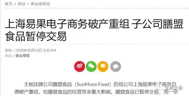 據了解,本次破產重組也影響了新加坡膳盟食品,上海易果電子商務是易果食品的最終控股公司,易果食品持有新加坡水果和海鮮分銷商膳盟食品(Sunmoon Food)59.9%的股權。子公司膳盟食品本周一(10月12日)早上進行了有關發文,當日早盤交易時股票大跌22.5%,目前已暫停交易。