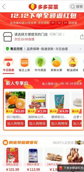 在盒馬鮮生“優選”區,拼多多的多多買菜里,也在今天推出了雙十二專場,通過購物紅包、滿減折扣等激勵消費。
