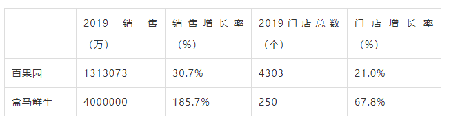 盒馬鮮生采用的是“線上外賣+線下門店”的經營模式。線上訂單主打五公里范圍,半小時送達的承諾;線下門店集合了展示、倉儲、餐飲等功能,與傳統零售門店相比更為豐富。2019年盒馬鮮生銷售額為400億,銷售增長率高達185.7%,全國250家門店,門店增長率為67.8%,位列中國連鎖百強企業第15名。