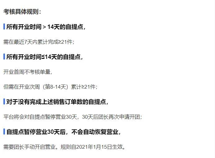 近日,橙心優(yōu)選對業(yè)績不好的團長(門店),也開啟了考核,對于考核不達標的團長,會給予暫停營業(yè)30天的處理。考核從2021年1月15日開始。受疫情影響的部分城市暫不考核,春節(jié)期間2月11-17日不計算在內。
