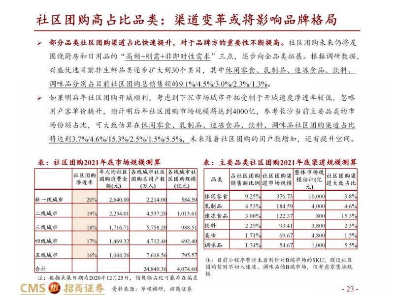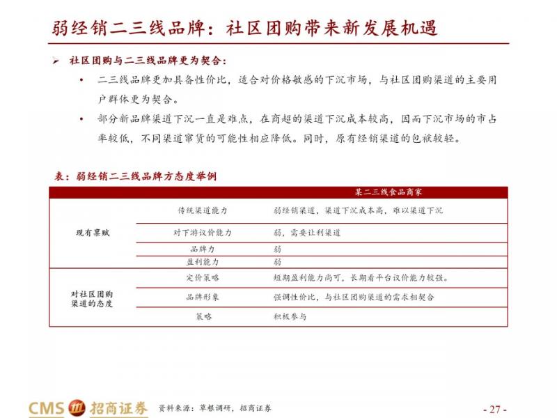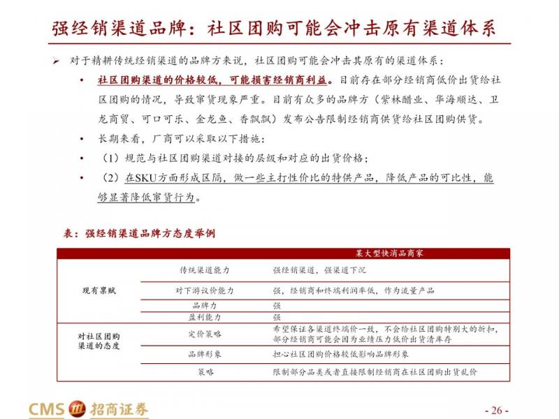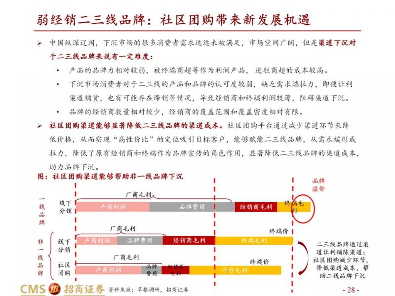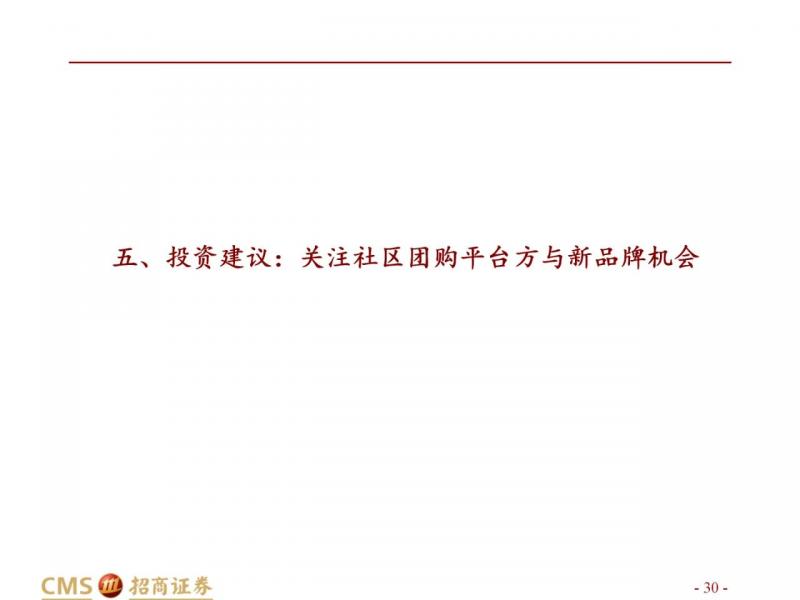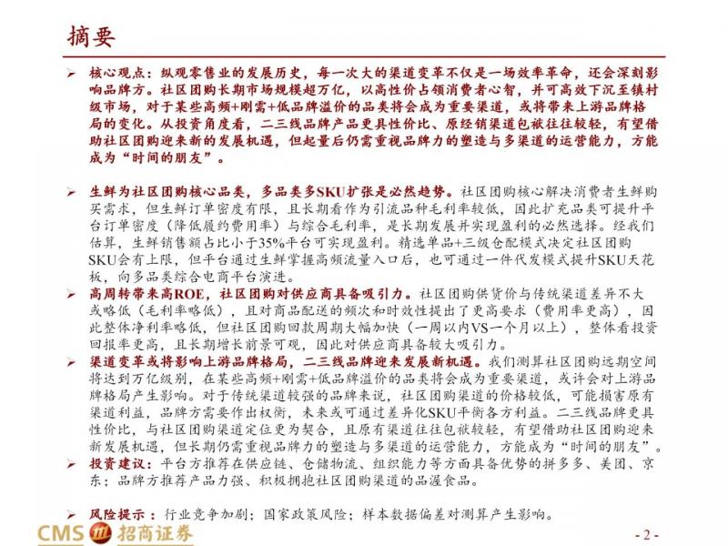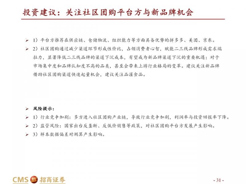 縱觀零售業的發展歷史,每一次大的渠道變革不僅是一場效率革命,還會深刻影響品牌方。社區團購長期市場規模超萬億,以高性價占領消費者心智,并可高效下沉至鎮村級市場,對于某些高頻+剛需+低品牌溢價的品類將會成為重要渠道,或將帶來上游品牌格局的變化。從投資角度看,二三線品牌產品更具性價比、原經銷渠道包袱往往較輕,有望借助社區團購迎來新的發展機遇,但起量后仍需重視品牌力的塑造與多渠道的運營能力,方能成為“時間的朋友”。