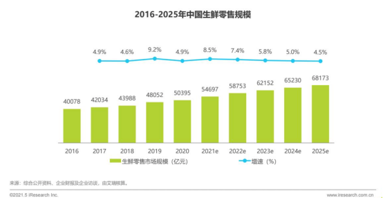 近年來,中國生鮮零售市場保持穩步增長,2020年中國生鮮零售市場規模超5萬億元。生鮮產品是基礎消費品之一,隨著國民人均可支配收入和消費支出的提高,艾瑞預計到2025年中國生鮮零售市場規模將增至6.8萬億元。