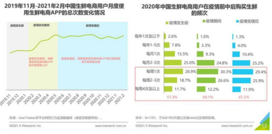 新冠疫情加速了生鮮的線上滲透。艾瑞監測數據顯示,2020年初疫情發生期間,消費者使用生鮮電商APP的次數顯著上升,在疫情平緩后,消費者使用生鮮APP的次數及網購生鮮頻次仍遠高于疫情發生前。由此可見,疫情培養了用戶使用生鮮電商平臺消費的習慣。