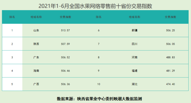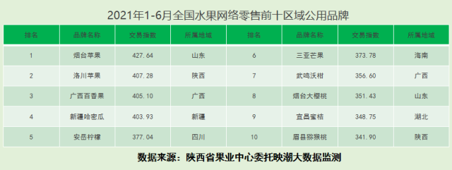 2021年1-6月全國水果區域公用品牌累計網絡零售額547.65億元,在水果農產品網絡零售額占比69.91%?!盁熍_蘋果”“洛川蘋果”穩居前兩位。