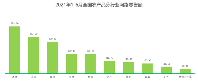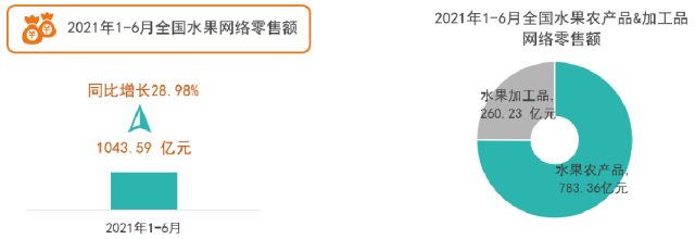 2021年1-6月,全國水果農產品線上銷售繼續提升,網絡零售額實現783.36億元,同比增長28.98%,在整體農產品網絡零售額中占比75%,為第一大品類。