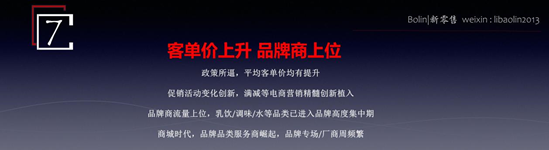 第7個大的變化是目前的客單價都在提升,這是比較好的一個點(diǎn),由過去靠低價來操作運(yùn)營的模式已經(jīng)轉(zhuǎn)變了。這個以品類以滿減、買贈、捆綁等營銷創(chuàng)新的手段都回歸到電商運(yùn)營的時代。在這種背景下,基本上來講,所有的品牌都有機(jī)會。在過去的兩三年里,品牌商最害怕的就是摧毀企業(yè)產(chǎn)品價盤的這種力量,但是今天為止這種作用力會越來越小,品牌商也越來越越多的參與到賽道里面。