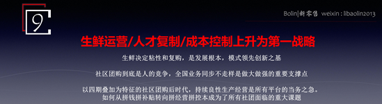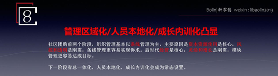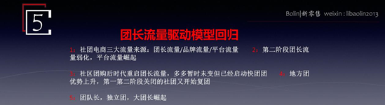第5個,其實(shí)社團(tuán)電商流量是以團(tuán)長來驅(qū)動的,社區(qū)團(tuán)購之所以能夠發(fā)展,也有兩條,第一條是傳統(tǒng)流動的速度,第二條是倉位積極的改革。在發(fā)展過程中,由于資本團(tuán)按照電商的邏輯,把團(tuán)長流量這個關(guān)鍵要素越來越虛化了,也導(dǎo)致了今天的市場格局,但由于大環(huán)境有變化,處在了后時代,所以團(tuán)長的回歸,目前全國范圍內(nèi),不管是資本團(tuán)還是其他,都在重新啟動參加。