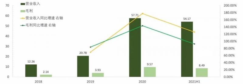 作為全國最大的自有品牌鮮果集團,洪九果品在近年來成長迅速,業(yè)績數(shù)據(jù)表現(xiàn)亮眼,呈現(xiàn)出翻倍增長的態(tài)勢。在2020年末和2021H1(2021年上半年),洪九分別實現(xiàn)營業(yè)收入57.71億元和54.17億元,對應(yīng)的同比增速分別高達177.72%和125.99%。同時,毛利也保持了高速增長,2020年末和2021H1洪九的毛利分別為9.57億元和8.49億元,對應(yīng)的同比增速則分別為143.51%和92.52%。
