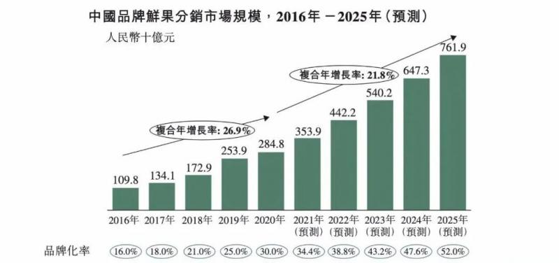 引領(lǐng)發(fā)展趨勢從財務(wù)形態(tài)可以看出,洪九當下的戰(zhàn)略是加速擴張,而這與我國鮮果分銷行業(yè)當下的發(fā)展階段可以說是高度匹配。目前,我國鮮果分銷行業(yè)整體上呈現(xiàn)出規(guī)模大、發(fā)展快、格局散、標準化/數(shù)字化程度低等的特征,這為頭部的鮮果企業(yè)進入快速增長通道提供了土壤。根據(jù)灼識咨詢數(shù)據(jù),2020年末我國品牌鮮果分銷行業(yè)的市場容量約2848億元,到2025年這一數(shù)據(jù)將增長至7619億元,五年間的CAGR(復(fù)合年均增長率)高達21.8%。