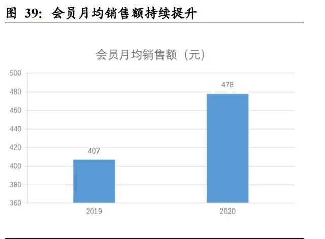 深耕會(huì)員體系,會(huì)員消費(fèi)占比持續(xù)提升。2021Q1 會(huì)員用戶數(shù)約 152 萬(wàn),占月交易用 戶數(shù)的 22%,但會(huì)員 GMV 貢獻(xiàn)占比達(dá) 47%。2019 年與 2020 年公司會(huì)員月均消費(fèi) 407 元、478 元,遠(yuǎn)高于非會(huì)員用戶。