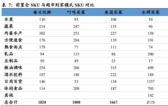 產(chǎn)品標(biāo)準(zhǔn)化,生鮮sku豐富,滿足一日三餐需求。由于我國(guó)飲食種類豐富,生鮮品 種繁多,消費(fèi)者通常一天三餐有多種品類的生鮮需求。但由于生鮮存儲(chǔ)時(shí)間較短, 尤其是葉類蔬菜、肉制品、水產(chǎn)品通常保鮮時(shí)間僅為 1-2 天,傳統(tǒng)生鮮電商平臺(tái)多 選擇儲(chǔ)存時(shí)間較久的根莖類蔬菜、硬果類水果、常溫乳制品、禽蛋類進(jìn)行銷(xiāo)售,而 存儲(chǔ)時(shí)間較久的這些生鮮品并不能滿足消費(fèi)者一餐需求,尤其是烹飪過(guò)程中通常還 需蔥姜蒜等調(diào)味類生鮮,傳統(tǒng)生鮮電商基本不能提供,因此消費(fèi)者仍需去線下補(bǔ)充 購(gòu)買(mǎi)其他產(chǎn)品。前置倉(cāng)則基本解決了這個(gè)問(wèn)題,能夠提供消費(fèi)者一日三餐基本生鮮 需求。以每日優(yōu)鮮和叮咚買(mǎi)菜為例,提供肉制品、乳制品、蔬菜、水果、水產(chǎn)品、 速凍食品、糧油調(diào)味、快手菜等生鮮全品類產(chǎn)品。