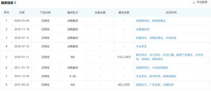 2015年9月,百果園經歷A輪融資,引入前海互興、廣發證券、天圖投資等4億元投資后,至2020年3月,公司先后進行了多達8次戰略性融資,匯集了中金資本、乾亨投資、前海母基金、基石資本、京江資本、中金匯融、越秀產業基金、深創投、招商局資本等十余家資本,先后融資金融高到幾十億元,單是2018年1月百果園B輪融資,規模就高達15億元。