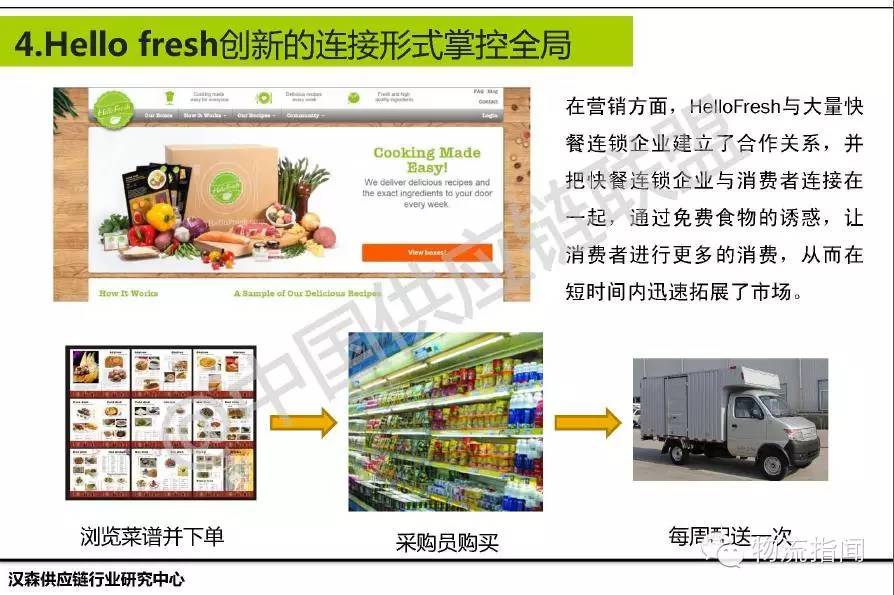 消費者可以在線上訂食譜,Hello fresh通過食譜給消費者送半成品食材,消費者只需要簡單再加工(如炒一下)就可以了,這個非常符合80后、90后的特點,不會做飯又想吃好吃的,同時還要求吃放心、安全的食物。