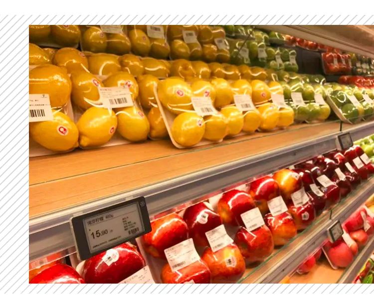 首先,在商品陳列上,生鮮水果全部為“扁平化陳列”方式,利用“大面積”有效創造視覺沖擊力。消費者進店之后,色彩紛呈的水果區便映入眼簾,荔枝、蘋果、鮮橙等各色水果應有盡有,蔬菜、飲品等承接在后,進而過渡至零食酒水、日用百貨、餐飲區等。