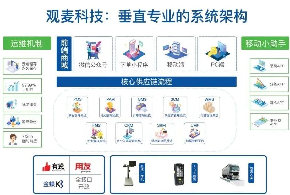 觀麥科技成立于2014年,業(yè)務覆蓋生鮮配送、凈菜加工、中央廚房、食品安全溯源等板塊,助力企業(yè)通過訂單、采購、分揀、配送、溯源、財務、銷售等全方位一體化管理實現(xiàn)降本增效。