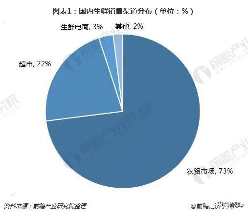 國內(nèi)生鮮銷售主要通過農(nóng)貿(mào)市場、超市、生鮮電商等渠道來完成,其中,傳統(tǒng)的農(nóng)貿(mào)市場是最主要的銷售渠道,其占比為73%,遠遠高于其他銷售渠道。