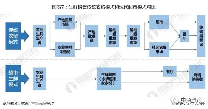 傳統(tǒng)農(nóng)貿(mào)模式的流通環(huán)節(jié)過于繁復(fù),而超市生鮮銷售模式具有直采直營、流通環(huán)節(jié)少、保證生鮮產(chǎn)品質(zhì)量和安全等諸多優(yōu)點,能從規(guī)模化采購、運輸設(shè)備、冷藏設(shè)備等領(lǐng)域提升產(chǎn)業(yè)鏈效率。