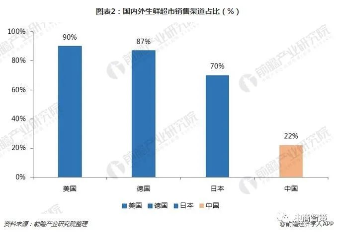 此外,以永輝超市、家家悅為代表的超市類現(xiàn)代生鮮農(nóng)產(chǎn)品物流供應(yīng)鏈模式也在逐漸興起,超市渠道占比為22%,位居第二。但是,相比于美國、德國和日本超市渠道占比分別為90%、87%和70%,中國超市渠道仍有很大的提升空間。