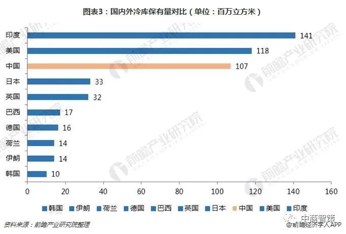 從冷庫保有量來看,2016年中國冷庫保有量為107百萬立方米,僅次于印度和美國,位列世界第三。包括日本、英國、德國和韓國在內(nèi)的一些發(fā)達國家冷庫保有量相對較少的原因在于一是這些國家的面積相對較小,很多地區(qū)可以實現(xiàn)在生鮮原產(chǎn)地的銷售;二是這些國家的氣溫炎熱的時間段相對較短,可以減少部分冷庫保溫的需求。因此,與我國可比性較強的是印度,印度同作為一個發(fā)展中國家,其冷庫保有量卻遠高于中國,這說明中國在冷庫建設(shè)方面,還有待提升。