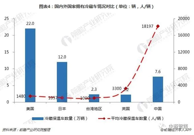 在冷藏車數(shù)量來看,一是在冷藏車絕對量上,我國還遠遠落后于美國與日本;二是在冷藏車平均量上,由于中國人口基數(shù)較大,而冷藏車總量較少,導(dǎo)致我國1.82萬人才擁有1輛冷藏車,這一指標(biāo)遠差于其他國家和地區(qū)。由此可見,我國生鮮運輸冷藏車數(shù)量還嚴(yán)重偏少。