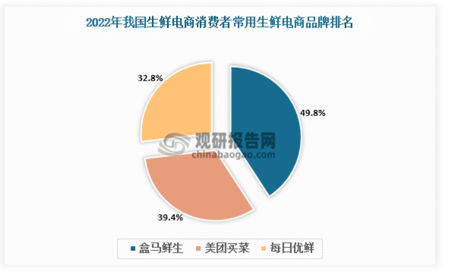 數據顯示,2022年我國生鮮電商消費者常用生鮮電商品牌排名前三的分別是盒馬鮮生、美團買菜、每日優鮮,分別占比49.8%、39.4%、32.8%。