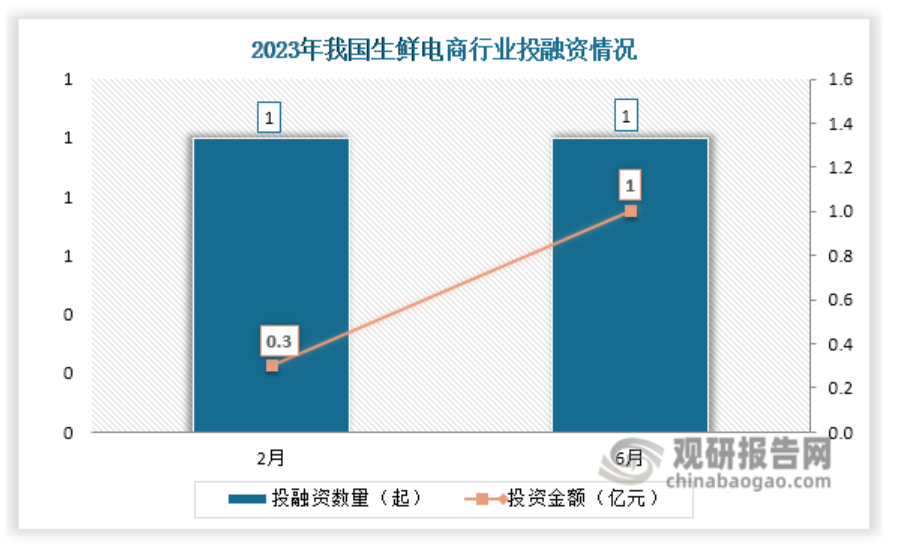 2023年1-10月24日我國生鮮電商行業共發生投融資事件2起,其中2月和6月投資事件數金額均為1起,投資金額最高的月份是6月,已披露投資金額1億元人民幣。