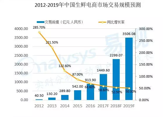 根據Analysys易觀發布的數據顯示,預計在2017年,中國生鮮電商交易規模將達到1449.60億元人民幣,同比增長58.6%。預計到2019年,中國生鮮電商交易規模將達到3506.08 億元人民幣。