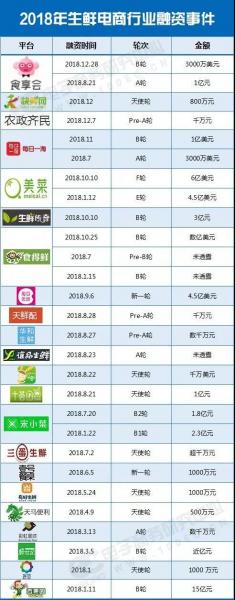 據電子商務研究中心不完全統計,2018 年共有 22 家生鮮電商企業共融資近 120 億元人民幣。包括:百果園、食范、鮮世紀、彩虹星球、天馬便利、有好生鮮、壹號餐桌、三蛋生鮮、宋小菜、十薈團、呆蘿卜、誼品生鮮、華和生鮮、天鮮配、每日優鮮、食得鮮、生鮮傳奇、美菜網、每日一淘、農政齊民、快鮮網、食享會等平臺上榜。