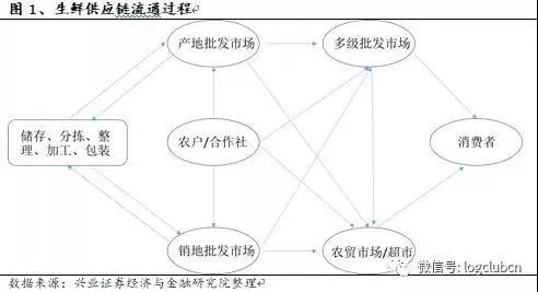 生鮮從農(nóng)戶到消費(fèi)者至少經(jīng)過4層的供應(yīng)鏈?zhǔn)秩唛L。由于上游極為分散,為了滿足農(nóng)產(chǎn)品在不同區(qū)域和不同季節(jié)時的需求,我國多年來形成了穩(wěn)定的以多級批發(fā)市場為主的生鮮流通體系,即分散的農(nóng)戶生產(chǎn)商品后,由大量經(jīng)紀(jì)人收購,運(yùn)輸至產(chǎn)地批發(fā)市場,隨后由銷地批發(fā)市場、二級批發(fā)商等分銷至零售端農(nóng)貿(mào)市場、超市等,最終到達(dá)終端消費(fèi)者。