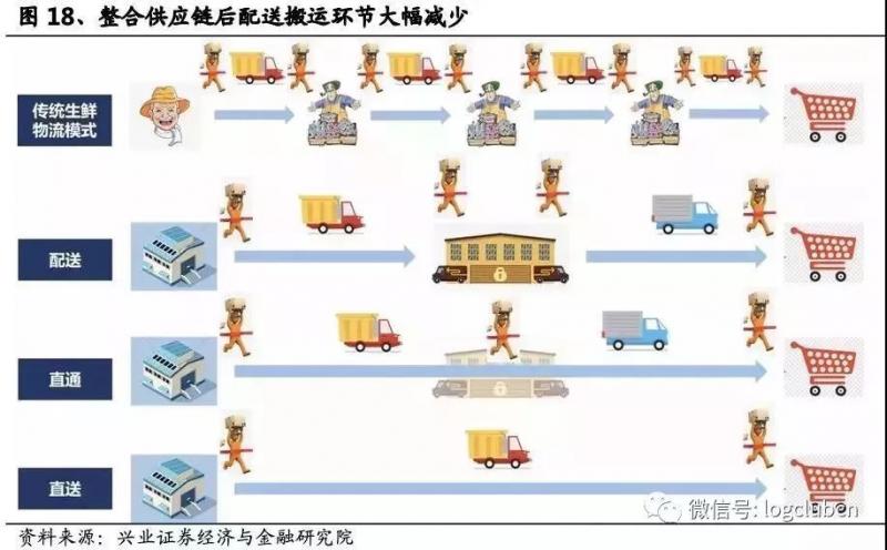 傳統(tǒng)生鮮物流模式下,商品需經(jīng)過至少三級轉(zhuǎn)運(yùn)——產(chǎn)地集貿(mào)市場/農(nóng)產(chǎn)品收集者+產(chǎn)地批發(fā)商+銷地批發(fā)商,其中涉及搬運(yùn)次數(shù)至少8次;企業(yè)整合供應(yīng)鏈后,配送模式基本分為三種: