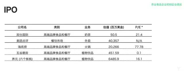 過去積極的投資在2018年也得到了正面的反饋,2018年該行業退出加速,食品飲料領域共有5個IPO,打破了2017年為0的記錄。IPO公司涉及植物蛋白飲料和食品原料、外賣,這些公司展現了中國食品創新的多樣性。