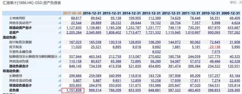 2009 年至 2016 年,八年時(shí)間里,匯源果汁有七年扣非凈利潤處于虧損狀態(tài)。在此期間,匯源果汁的負(fù)債率也在不斷攀升。2017 年中報(bào)數(shù)據(jù)顯示,匯源果汁的總負(fù)債規(guī)模已經(jīng)達(dá)到 115.18 億元。