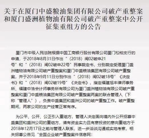 2018年12月6日,廈門市中院再發公告,公開向境內外征集中盛破產后的重組方。