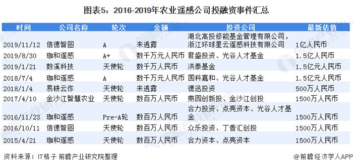 根據IT桔子數據查詢,2016-2019年,農業遙感企業共發生投融資事件不足10起,而僅有信德智圖和珈和遙感獲得超過2輪以上的融資。從整體來看,農業遙感企業的融資進程仍處于A輪及其以前,成熟的公司較少。綜上說明農業遙感行業仍處于不完全競爭的市場前期,行業發展機會巨大。