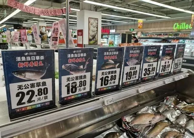 7月27日,媒體在物美超市沁山水店注意到,超市內水產區和蔬菜區上線了兩類不同的商品,分別是包裝鮮魚和處理好的加工蔬菜。