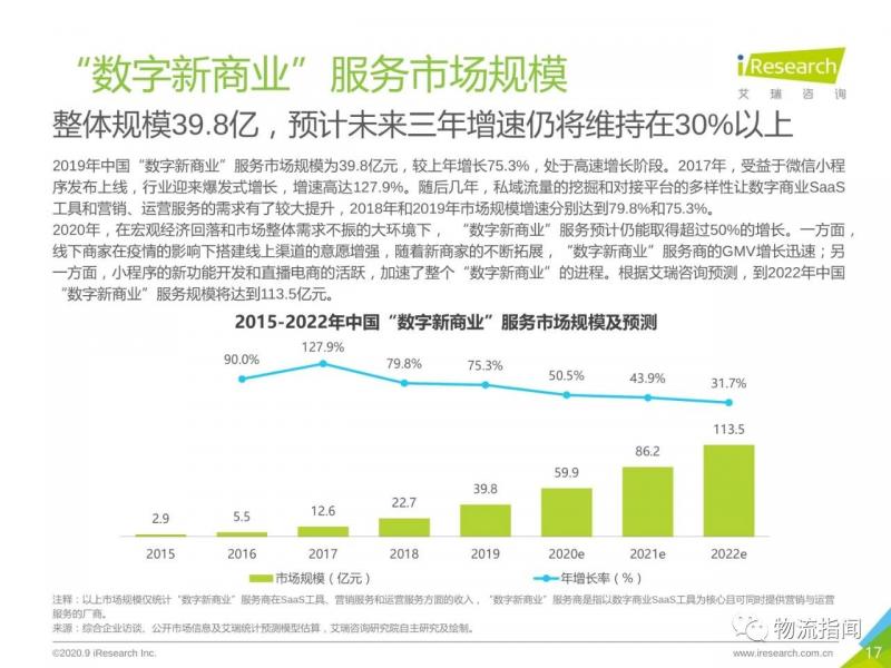 統計顯示,2019年中國“數字新商業”服務市場規模為39.8億元,較上年增長75.3%,處于高速增長階段。預計在2020年宏觀經濟回落和市場整體需求不振的大環境下,“數字新商業”服務仍能取得超過50%的增長,到2022年整體市場規模將達到113.5億元。