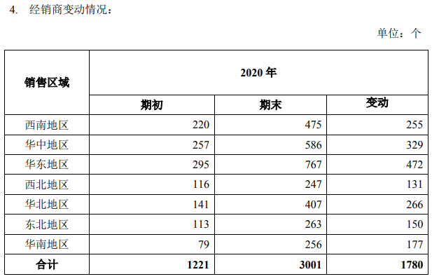 截至2020年末,公司合作的經銷商數量達3001個,與年初相比凈增1780個。