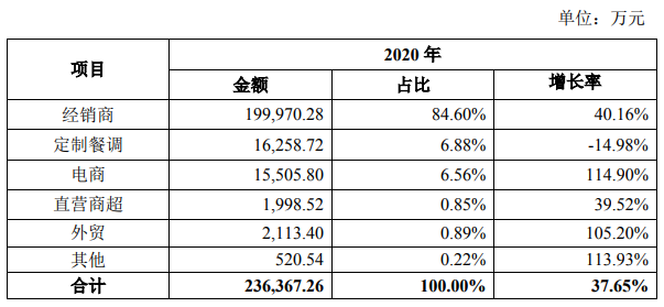 天味食品建立了線上、線下覆蓋全國的市場營銷體系和強大的營銷網絡,形成了以經銷商為主,定制餐調、電商、直營商超為輔的營銷架構。分銷售渠道來看,經銷商渠道營收20.00億元,同比增長40.16%,占據總營收比重84.60%;定制餐調渠道營收1.63億元,同比下降14.98%;電商渠道營收1.55億元,同比增長114.90%,營收增長最快;直營商超渠道營收0.20億元,同比增長39.52%;外貿渠道也取得了較為亮眼的成績,營收0.21億元,同比增長105.20%。