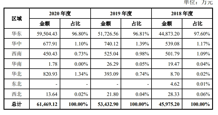 目前,公司主要市場(chǎng)在華東地區(qū),其中江浙滬是核心銷售區(qū)域。2018年至2020年,味知香來(lái)自華東地區(qū)的收入為4.49億元、5.17億元、5.95億元,分別在其各期總收入中占比高達(dá)97.6%、96.81%、96.8%。