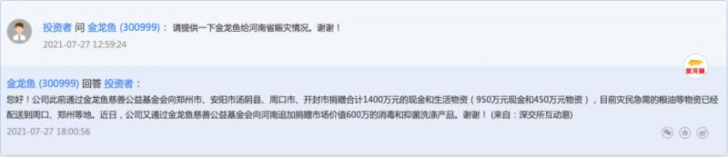 金龍魚(yú)表示,公司通過(guò)金龍魚(yú)慈善公益基金會(huì)向鄭州市、安陽(yáng)市湯陰縣、周口市、開(kāi)封市捐贈(zèng)合計(jì)1400萬(wàn)元的現(xiàn)金和生活物資(950萬(wàn)元現(xiàn)金和450萬(wàn)元物資),之后又向河南追加捐贈(zèng)市場(chǎng)價(jià)值600萬(wàn)的消毒和抑菌洗滌產(chǎn)品。