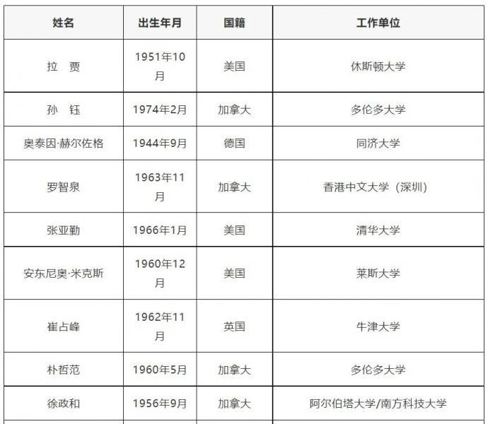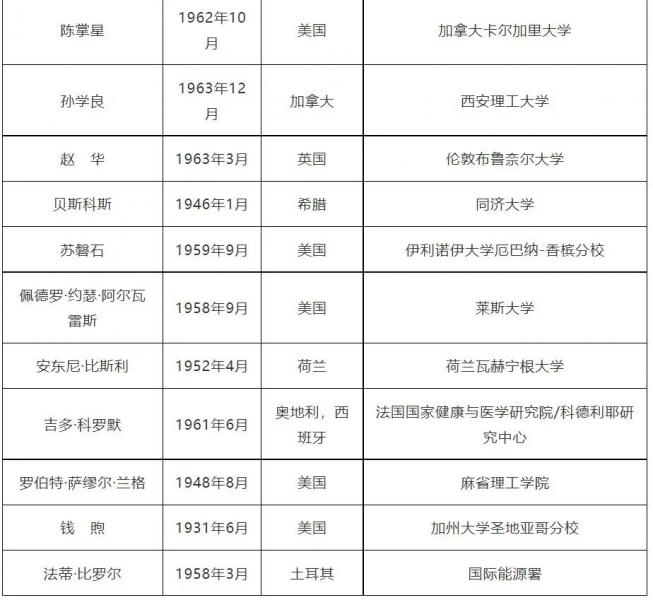 中國工程院2021年當選外籍院士名單(共20人)
