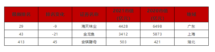 其中,海天味業市值4428億元,位居榜單第29名,相比2020年下降9名;金龍魚市值為3412億元,位居榜單第43名,相比2020年下降21名;安琪酵母市值503億元,位居榜單第413名,相比2020年上升45名。