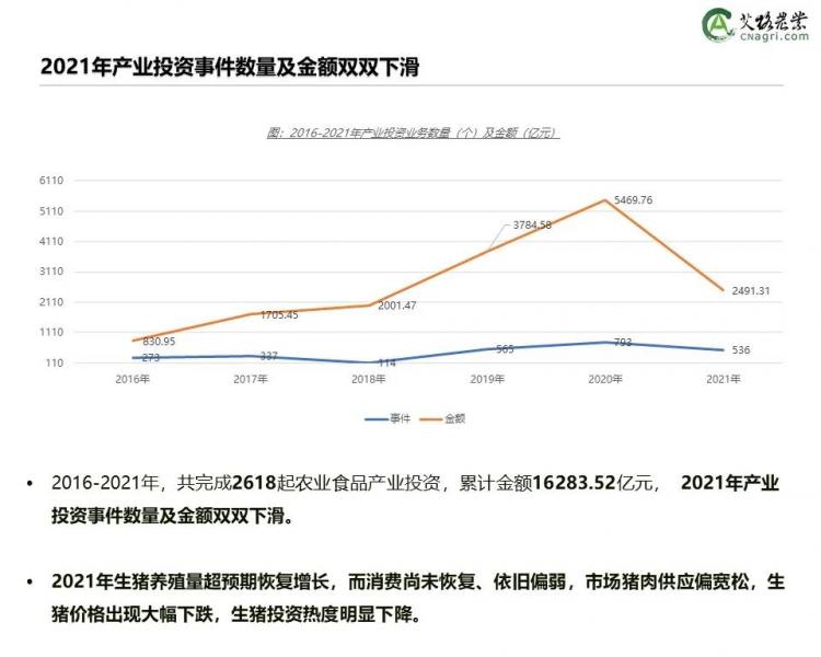 產業投資,2021年生豬養殖量超預期恢復增長,而消費尚未恢復、依舊偏弱,市場豬肉供應偏寬松,生豬價格出現大幅下跌,生豬投資熱度明顯下降,導致畜牧產業投資事件數量及金額大幅縮減。