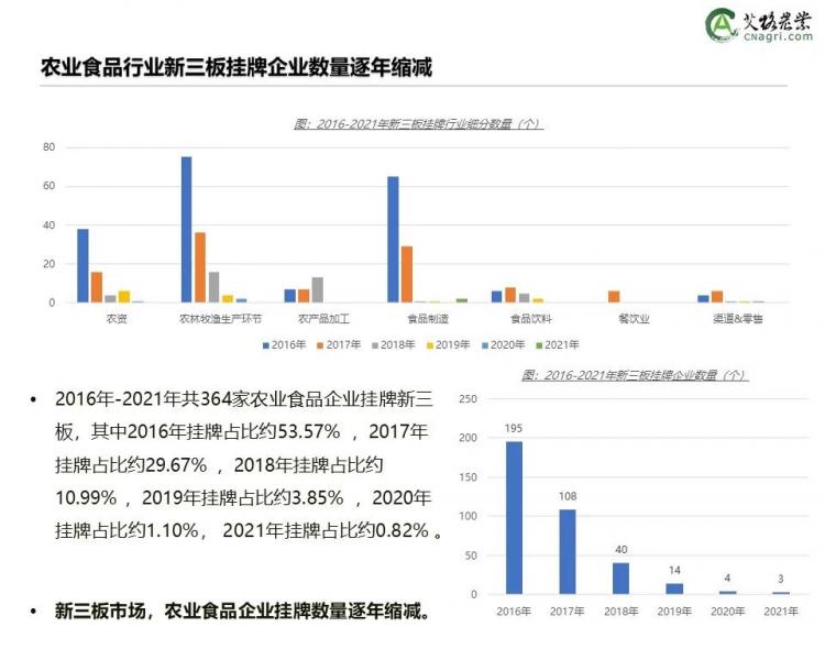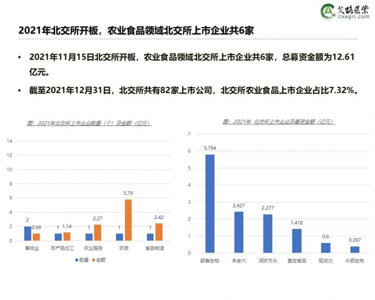 北交所:2021年11月15日北交所開板,截至2021年12月31日,北交所共有82家上市公司, 其中農業食品領域共6家,占比7.32%。